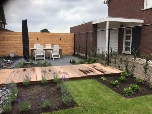 Een element dat onmiddellijk opvalt in dit ontwerp is het sierlijke waterloopje, dat niet alleen een rustgevend geluid biedt maar ook een visuele verrijking. In combinatie met de stijlvolle vlonder creëert dit een dynamische en speelse dimensie binnen de tuin die uitnodigt om te verkennen en te ontspannen.
